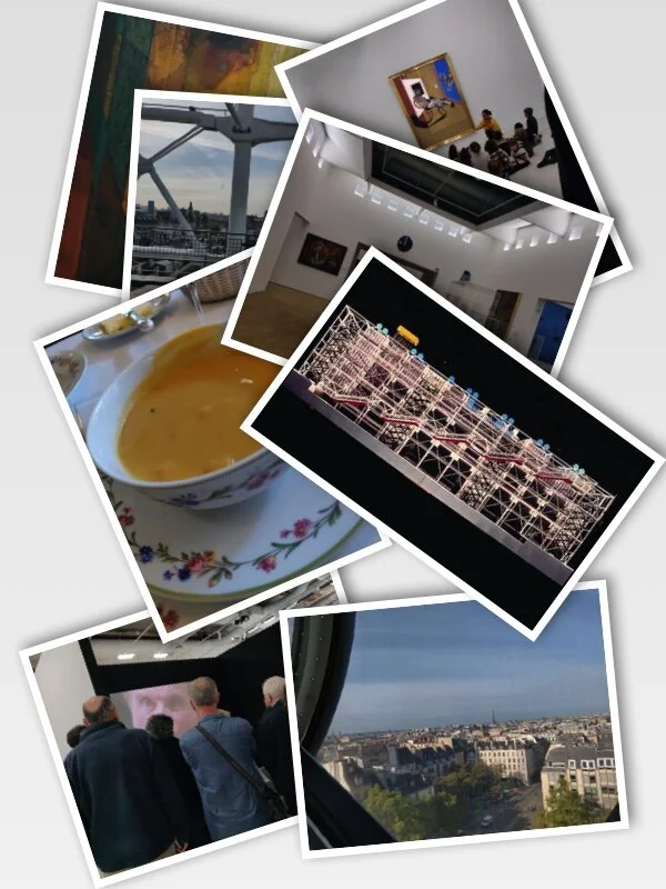 It was one of the first 'inside/out' or 'bowellism' buildings with all its services such as staircases, lifts, ductwork, electrical power conduits and water pipes on the outside, leaving an uncluttered space inside. All the building's 'bowels' are outside. For this reason, the street to rooftop escalator on the outside of the building in a glass tube is one of Paris' most popular spots to photograph Paris - look at a couple of my photos in the collage.